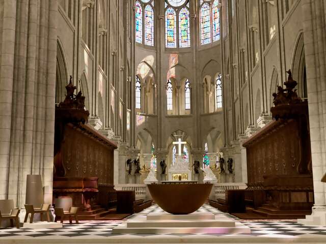 The cathedral’s renowned stained glass was thankfully undamaged in the fire. But it, too, was lovingly and painstakingly cleaned, revealing glorious renewed colors that stand out even more against the creamy freshly-cleaned limestone.