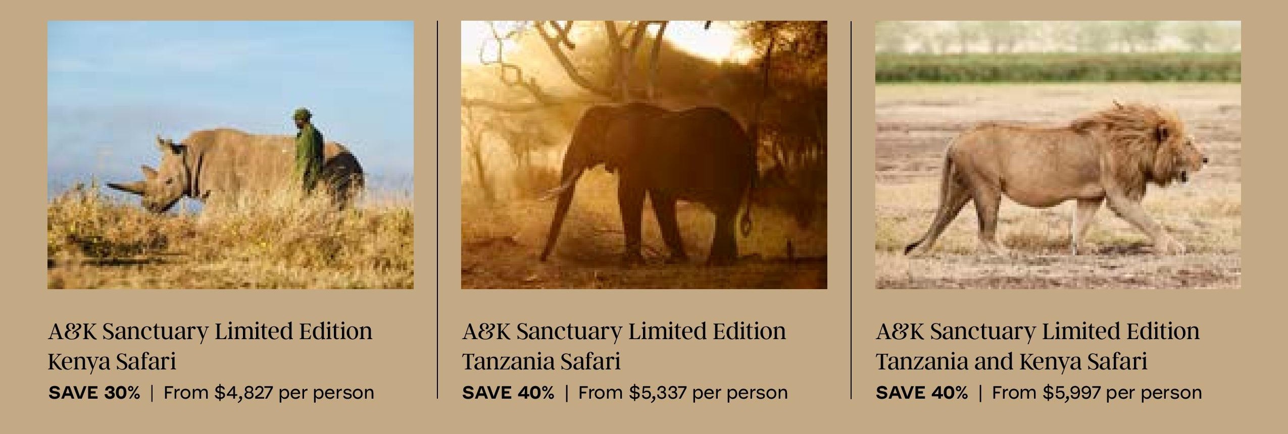 From prices shown reflect the savings amount. Offer valid on new bookings on A&K Sanctuary Limited Edition itineraries booked by October 22, 2025. Full payment is due at the time of confirmation and is non-refundable. Not combinable with any other offers. Cruising the Seychelles offer valid on new bookings only for stateroom categories 1-3, double occupancy. Must be booked with select A&K Sanctuary Limited Edition East Africa itineraries by October 22, 2025. Offers are subject to availability and may be withdrawn at any time. Other restrictions may apply. ©2025 Abercrombie & Kent USA, LLC CST #2007274-20